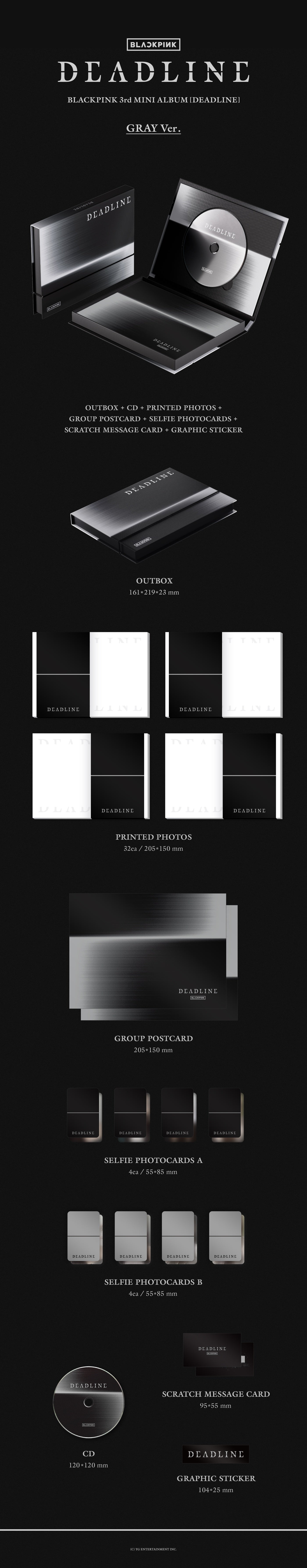 BLACKPINK 3rd MINI ALBUM [DEADLINE] GRAY Ver.은 개인 인화사진, 단체 포스트카드, 그래픽 스티커, 셀피 포토카드, 크레딧 포스트카드, 스크래치 메세지카드 등으로 다채롭게 구성하였으며 오는 1월 15일 예약판매를 시작하여 2월 27일 13시부터는 전국 온/오프라인 음반 매장에서 만나볼 수 있다.