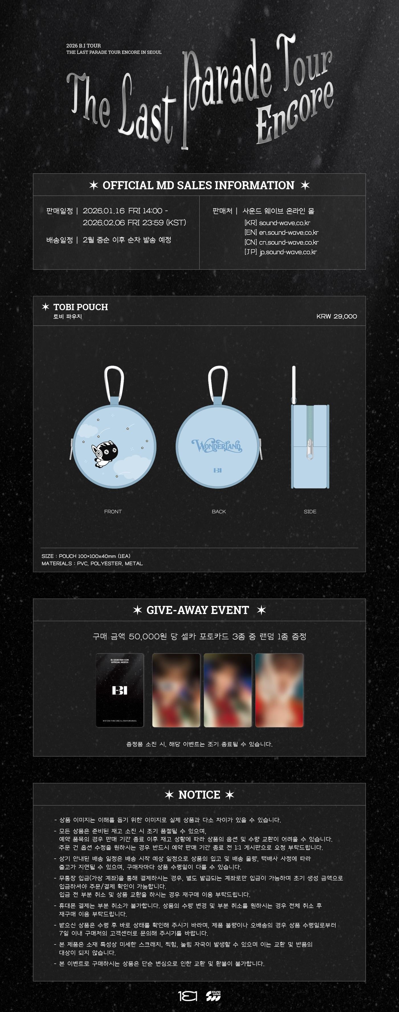 B.I - [The Last Parade Tour in SEOUL] 2026 ENCORE CONCERT MD TOBI POUCH