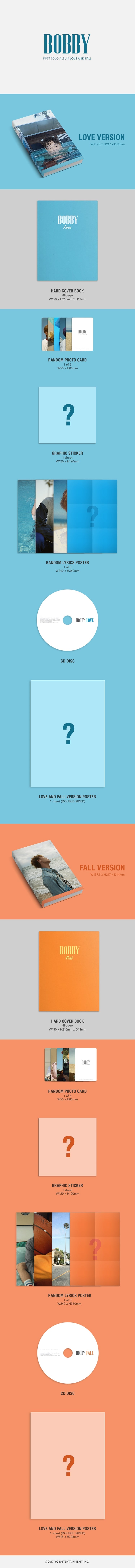 BOBBY FIRST SOLO ALBUM | LOVE AND FALL |은 LOVE VER, FALL VER. 총 2종으로 발매되며, 오는 9월 8일부터 예약판매를 시작하여 9월 15일부터 YG이샵을 비롯 전국 온/오프라인 음반 매장에서 만나볼 수 있다.