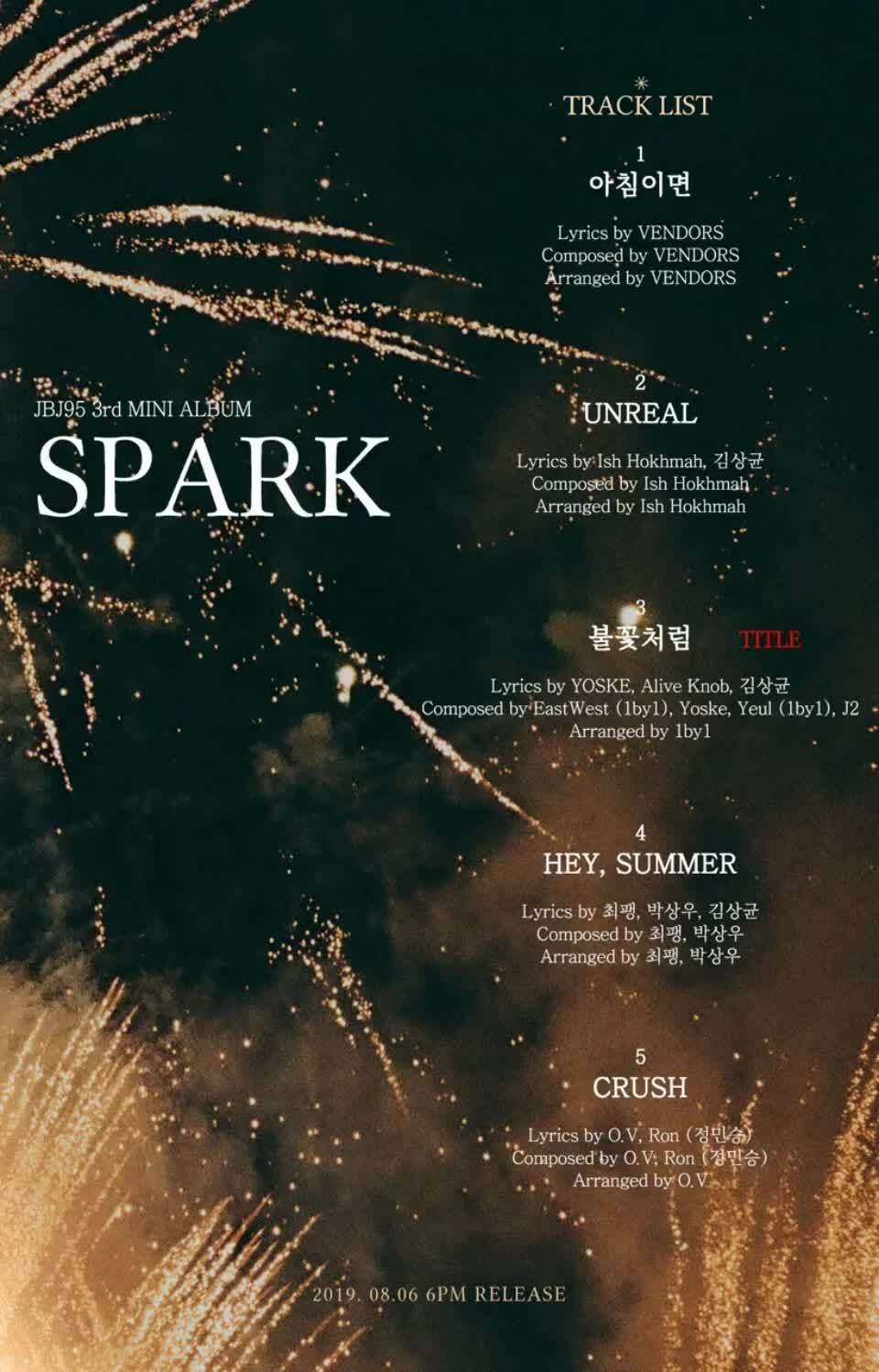 JBJ95가 약 4개월 만에 발표하는 신보 < SPARK >는 여름이라는 계절이 주는 다양한 감정을 보여주는 앨범이다. 1번 트랙 “아침이면”에서 마지막 트랙 “CRUSH”까지 이어지는 구성은 ‘한 여름 날의 사랑’ 이라는 주제로 시간의 흐름에 따른 감정의 서사를 느낄 수 있게 해준다.앨범명 < SPARK >는 타이틀곡 “불꽃처럼”에서 느껴지는 불꽃이 터지는 이미지를 통해 여름 밤의 사랑을 점화시킨다는 의미를 담고 있다. 필름 카메라를 통해 담아낸 아련한 색을 입은 사진과 한 편의 영화를 보는 듯한 뮤직비디오는 막 시작한 사랑에 더욱 진한 여운을 남긴다.