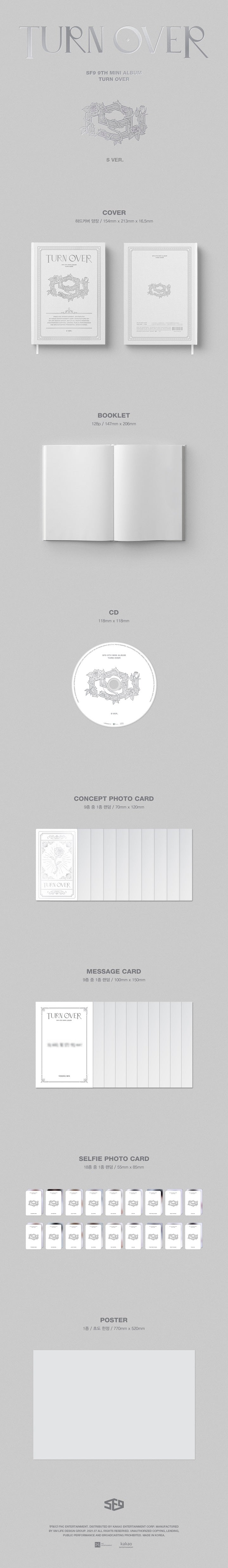 SF9's 9th mini album 'TURN OVER', which left a deep impression on the public through broadcasting, is the last album in the SF9 world view series '9lory', which has been developing since 2020. SF9 consists of two '9lory' series, including the 1st regular album 'FIRST COLLECTION', which depicts SF9 finally united with 9 golden bracelets forming a sphere, and the 8th mini album '9loryUS', which contains moments of splendid glory. Through the album, SF9's world was drawn out.