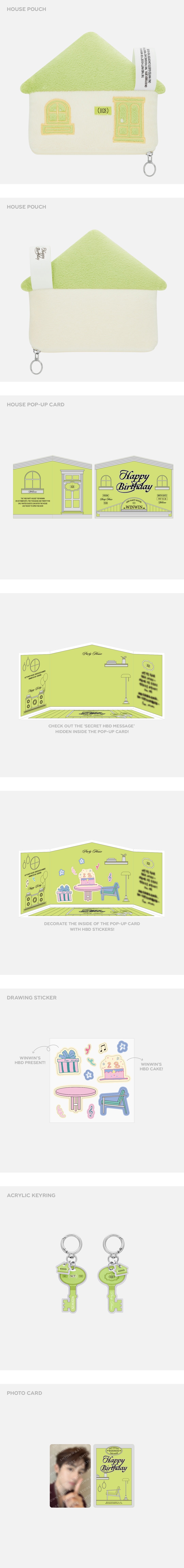 - 사이즈(CM) : 하우스 파우치 18x14.8, 팝업 카드 12.5x10, 스티커 9.5x9.5, 포토카드 5.5x8.5, 열쇠 아크릴 키링 3.6x6.1